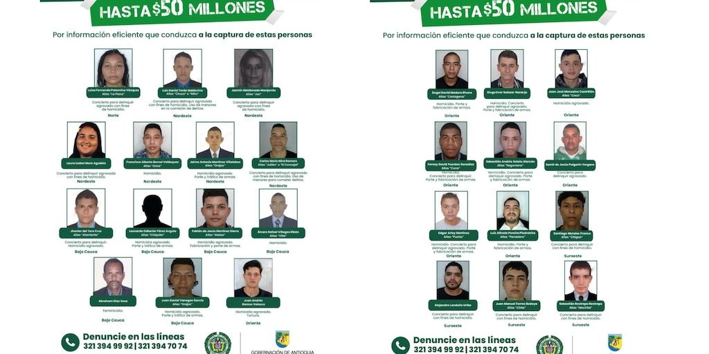 La Gobernación de Antioquia y la Policía Nacional renovaron el cartel de los 27 delincuentes más buscados en el departamento por delitos graves como homicidio, homicidio agravado, feminicidio, tortura, concierto para delinquir agravado y porte ilegal de armas, ofreciendo recompensas de hasta 50 millones de pesos por información que facilite su captura. El anuncio lo hicieron el secretario de Seguridad de Antioquia, Luis Eduardo Martínez Guzmán, y el coronel Luis Muñoz, comandante de Policía Antioquia, destacando la presencia de estos prófugos en regiones como Bajo Cauca, Nordeste, Suroeste, Oriente y Norte. En las últimas horas se reportaron dos capturas y la muerte de uno de ellos anoche en el municipio de Andes, corregimiento de Santa Inés, gracias a inteligencia policial y colaboración ciudadana.