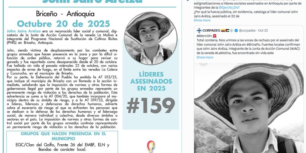«Con este caso, John Jairo Areiza se convierte en el líder social número 159 asesinado en Colombia en lo que va de 2025» — Indepaz