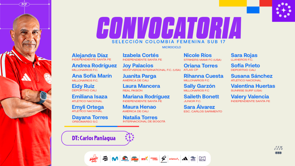 Alejandra Díaz – Independiente Santa Fe, Andrea Rodríguez – Millonarios FC, Ana Sofía Marín – Millonarios FC, Eidy Marcely Ruiz – Deportivo Cali, Emiliana Isaza – Atlético Nacional, Emily Vanesa Ortega – Atlético Nacional, Helis Dayana Torres – Orsomarso S.C, Izabela Cortés – Independiente Santa Fe, Joy Palacios – Monteverde Internacional Fútbol Club (USA), Juanita Parga – América de Cali, Laura Nataly Mancera – Real Pasión (Liga Cundinamarca), Mariana Rodríguez – Independiente Santa Fe, Maura Henao – América de Cali, Natalia Sofía Torres – Internacional de Bogotá , Nicoles Ríos Mejía – Strikers Miami FC (USA), Oriana Torres – Atlas CP – (Liga Valle), Rihanna Cuesta Narcí – Millonarios FC, Sally Victoria Garzón – Millonarios FC, Saileth Bonett – Junior FC, Sara Álvarez – Escuela Sarmiento (Liga Valle), Sara Gabriela Rojas – Llaneros FC, Sofía Prieto – Deportivo Cali, Susana Sánchez – Atlético Nacional, Valentina Huertas – Sunrise Surf (USA) y Valery Valencia – Independiente Santa Fe.