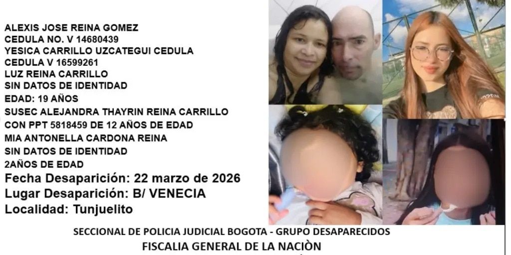 Una familia compuesta por cinco integrantes, entre ellos dos menores, desapareció el 22 de marzo en el barrio Venicia, al sur de Bogotá. Los afectados son Alexis José Reina Gómez, Yessica Carrillo Uzcátegui y sus hijas Luz Alexandra Reina, de 19 años, Susec Alejandra Reina y la bebé Mia Antonella Reina. Fueron vistos por última vez en el parque del barrio, y recientemente se difundió un audio de Luz Alexandra que revela el secuestro de la pequeña Mia Antonella, además de la separación del grupo familiar.