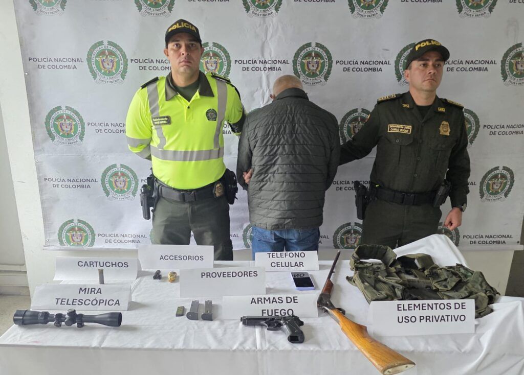 Las diligencias de registro y allanamiento se realizaron en los barrios El Vergel (vereda Bajo Tablazo) y La Isla, donde las autoridades incautaron dos armas de fuego —una escopeta y una pistola—, una mira telescópica para armamento de largo alcance, tres proveedores, munición de diferentes calibres, una empuñadura para revólver y un chaleco militar tipo arnés.
