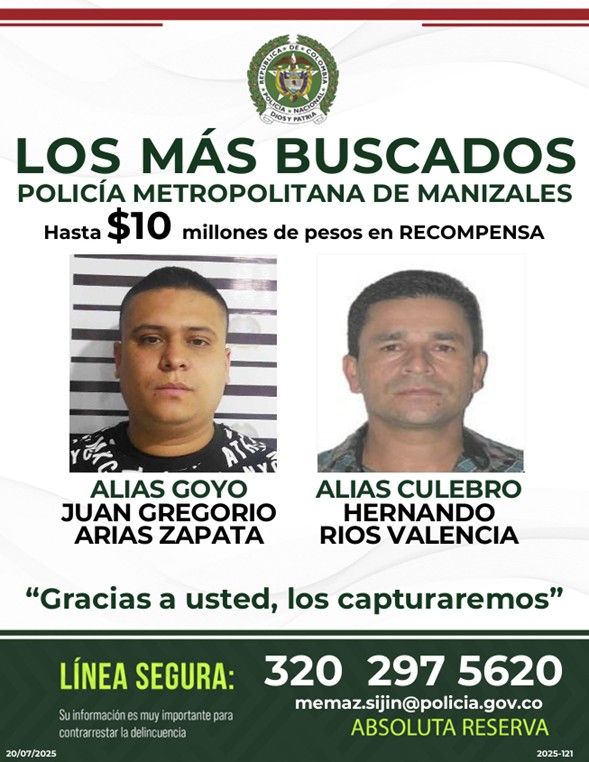Entre los señalados figuran alias ‘Culebro’ y ‘Goyo’, requeridos por homicidio agravado y presuntamente implicados en varios hechos ocurridos en Manizales entre 2024 y 2025. Por información que permita su captura, la Alcaldía ofrece recompensas de hasta 10 millones de pesos.