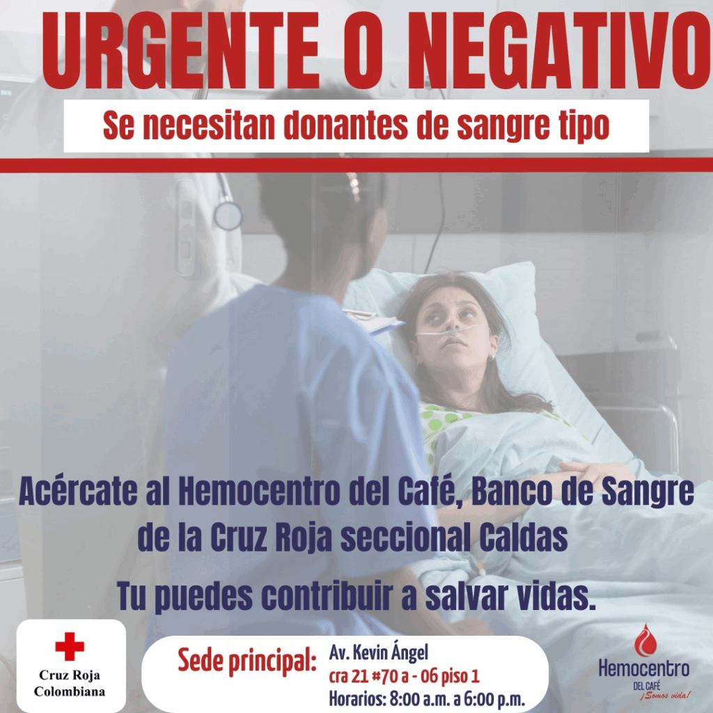 El Hemocentro del Café informó que atraviesa una escasez alarmante de sangre tipo O negativo, considerada de vital importancia por ser el grupo sanguíneo universal que puede transfundirse a cualquier persona en situaciones de emergencia.