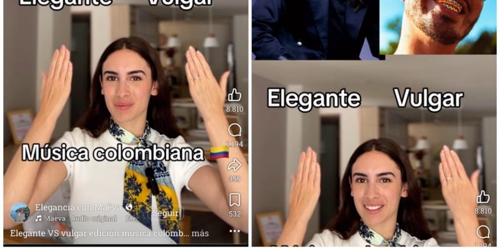 La influencer francesa Maeva, conocida por su página de Facebook ‘Elegancia con Maeva’, generó un amplio revuelo al clasificar recientemente varias canciones icónicas de la música colombiana en categorías de «elegantes» o «vulgares». En su selección, compartida en la red social, incluyó temas de artistas como Juanes, Bacilos, el trío de América, Karol G, J Balvin y Maluma, emitiendo juicios rápidos sobre su estética sin profundizar en fundamentos detallados.