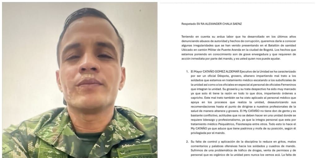 Soldados, suboficiales, oficiales y personal de salud del Batallón de Sanidad del Ejército Nacional, con sede en el Cantón Militar de Puente Aranda en Bogotá, han denunciado graves irregularidades bajo la gestión del mayor Aldemar Cataño Gómez, quien funge como Ejecutivo y Segundo Comandante de la unidad. Las acusaciones incluyen malos tratos, abuso de autoridad, autoritarismo, tráfico de drogas, venta de permisos, falta de disciplina, anomalías en los pagos de alimentación e incapacidades, así como desautorización de recomendaciones médicas, gritos, ofensas e incidentes de irrespeto entre soldados y oficiales, sin reportar salidas en el sistema NOVESOL y con partes de alimentación inflados. La denuncia fue recibida y difundida recientemente por Alexander Chala Sáenz, sargento retirado y activista, a través de testimonios anónimos internos que remitieron directamente a él y que compartió públicamente en la red social X.
