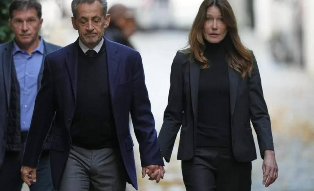 Antes de subir a su coche, acompañado de su esposa Carla Bruni, se detuvo para saludar a seguidores que lo aguardaban frente a su domicilio, según testigos.