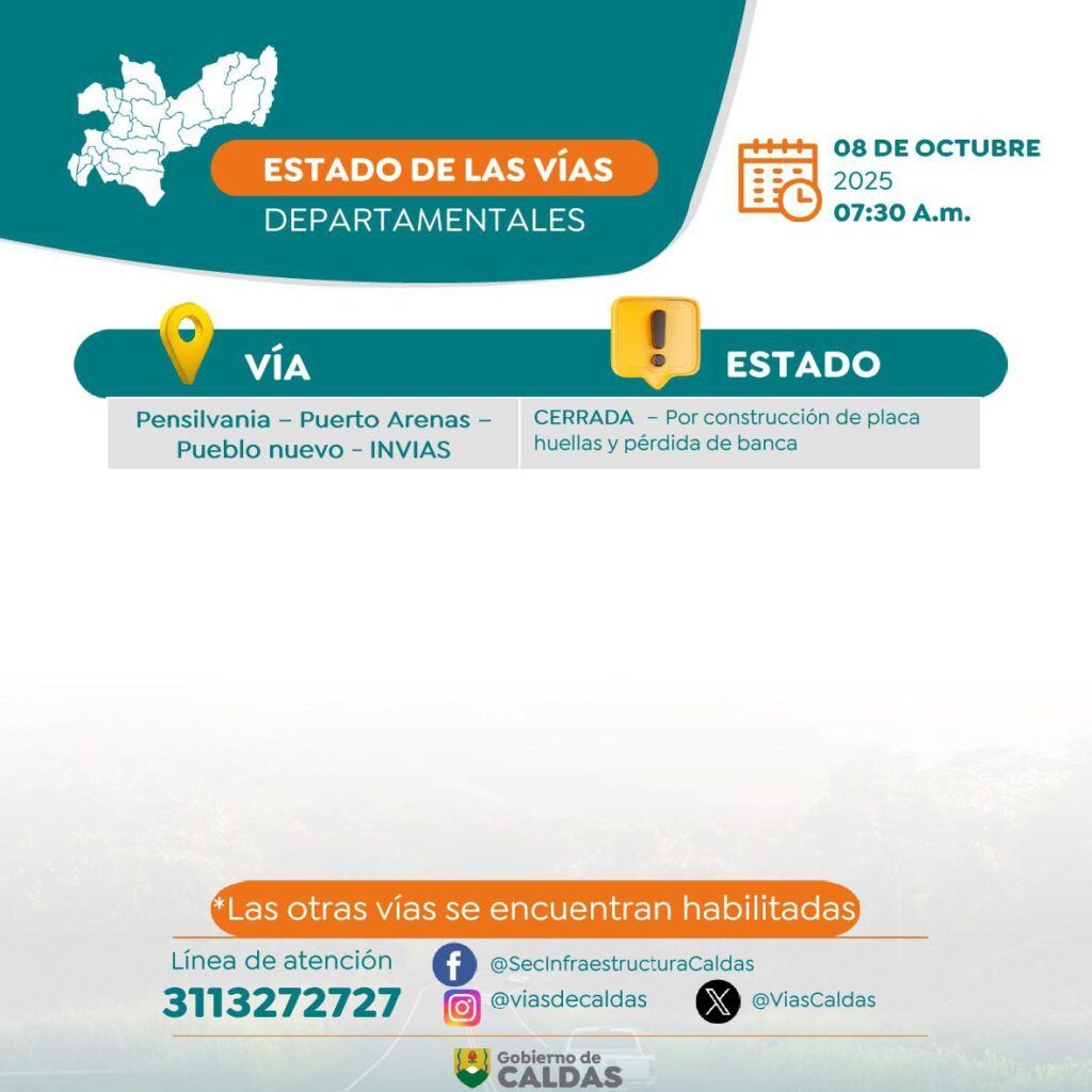 La línea de atención 3113272727 y las redes sociales @SecInfraestructuraCaldas y @Viasdecaldas permanecen disponibles para recibir reportes o inquietudes sobre el estado de las carreteras.
