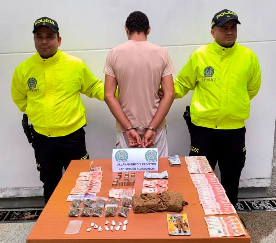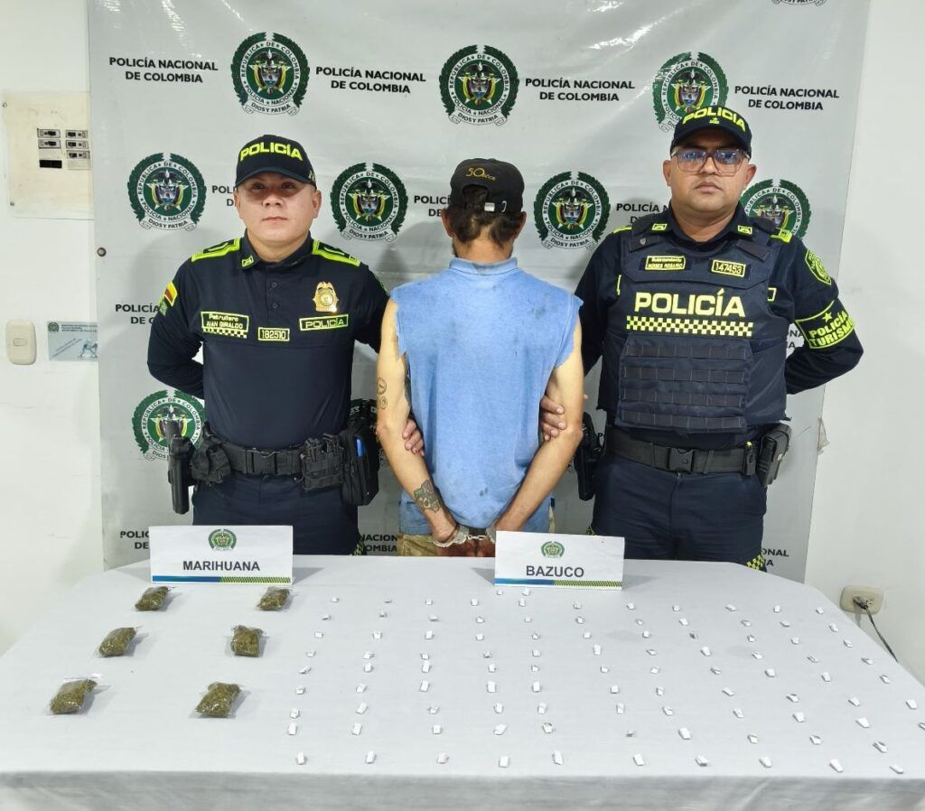 Durante la intervención se incautaron más de 545 gramos de marihuana prensada y dosificada, 12 dosis de bazuco y dinero en efectivo. El capturado registra antecedentes judiciales, con una condena previa por el mismo delito en el año 2007.