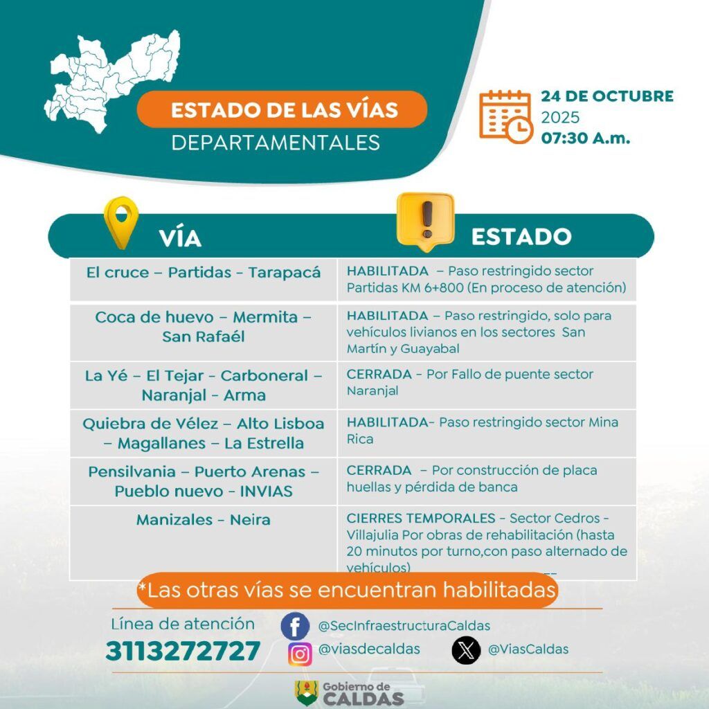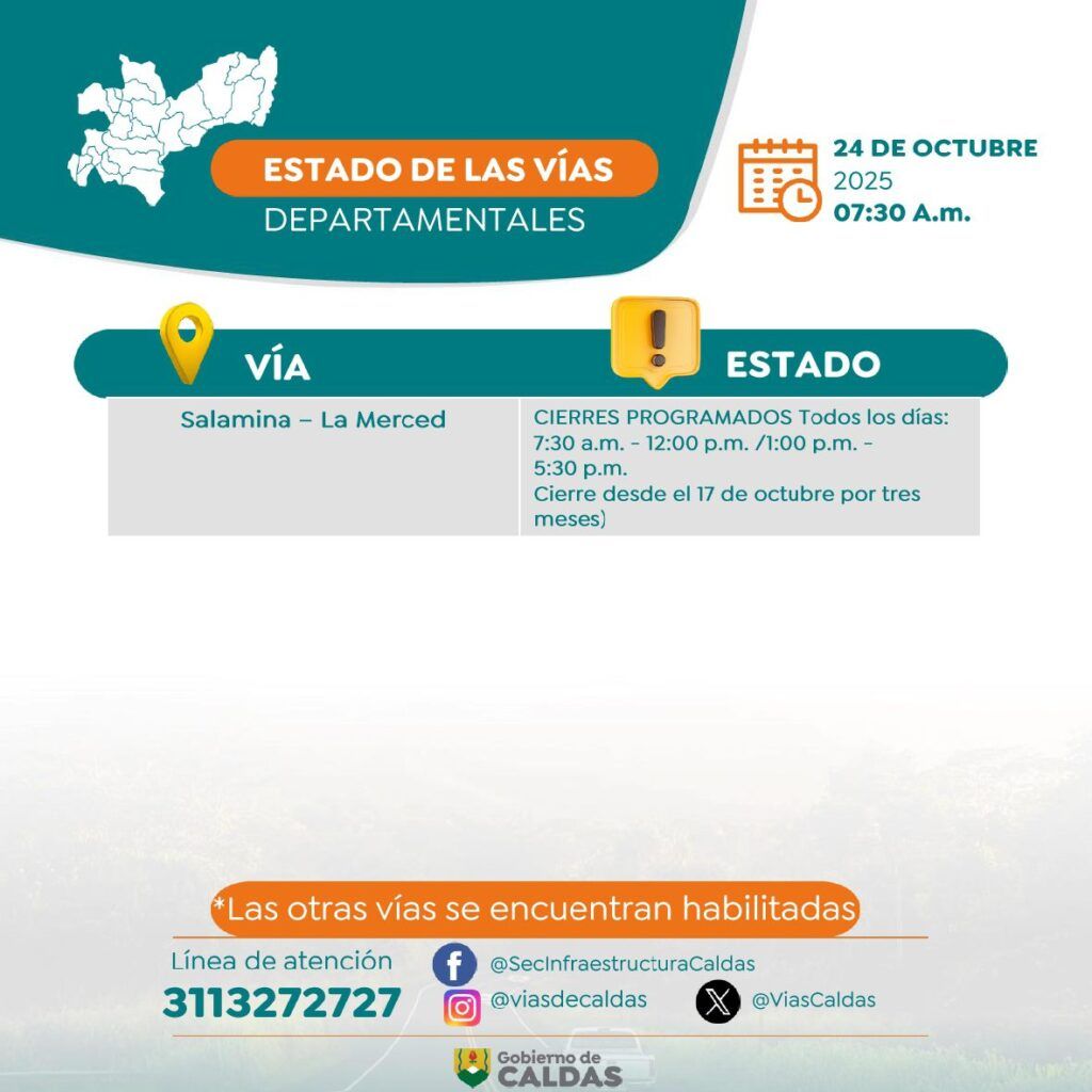 La Secretaría de Infraestructura informó además que la vía Salamina–La Merced tendrá cierres programados todos los días, de 7:30 a. m. a 12:00 m. y de 1:00 p. m. a 5:30 p. m., durante tres meses. El resto de los corredores departamentales se encuentra habilitado, y la línea de atención para reportar novedades sigue activa en el número 311 327 2727.