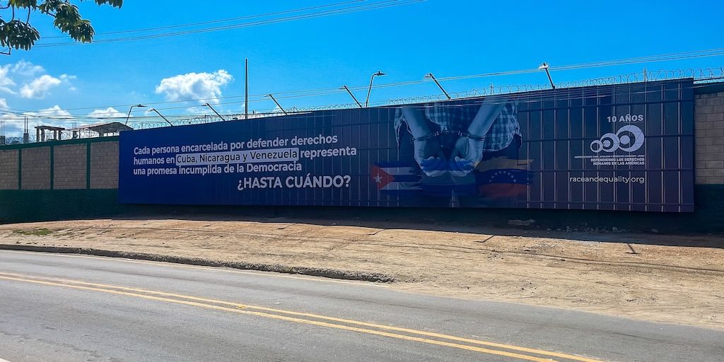 «Cada persona encarcelada por defender los derechos humanos en Cuba, Nicaragua y Venezuela representa una promesa incumplida de la democracia. ¿Hasta cuándo?» – Texto de la valla (crédito @raceandequality/X)