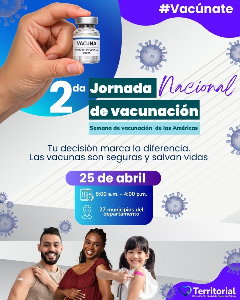 En este marco, la DTSC invitó a la comunidad de Caldas a participar en la Gran Jornada de Vacunación de las Américas, programada para sábado 25 de abril en todos los municipios del departamento. Durante la jornada estarán disponibles biológicos para menores de 6 años, mujeres gestantes y adultos mayores, incluida la vacuna contra la influenza.