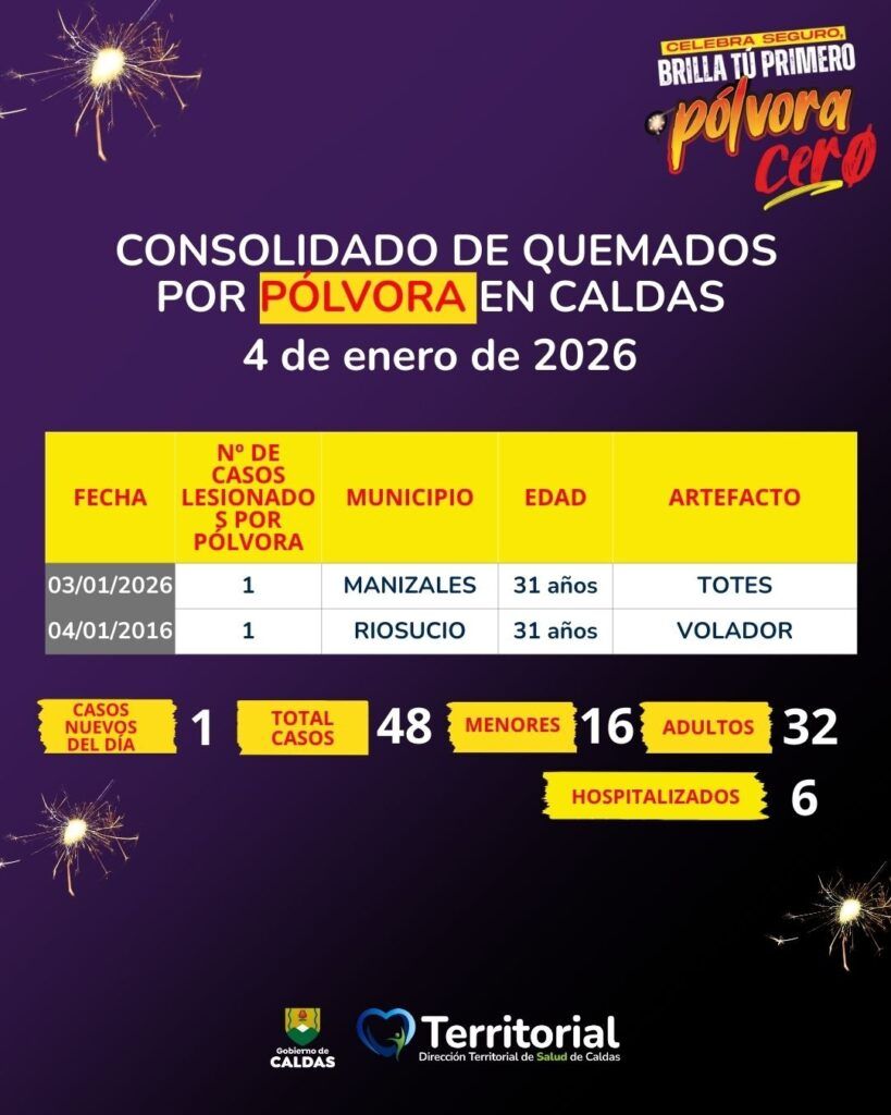 La Dirección Territorial de Salud de Caldas (DTSC) mantiene vigente su vigilancia sobre los casos de quemados por pólvora, con seguimiento activo desde el 1 de diciembre de 2025.
