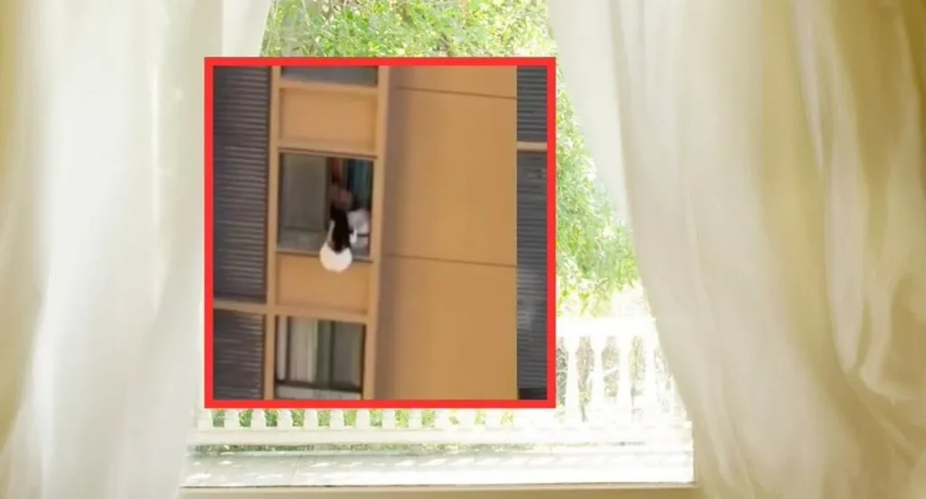 De acuerdo con las imágenes, la mujer sale por la ventana y queda suspendida de la estructura externa, sujetándose con cautela mientras busca acercarse a otra vivienda adyacente.